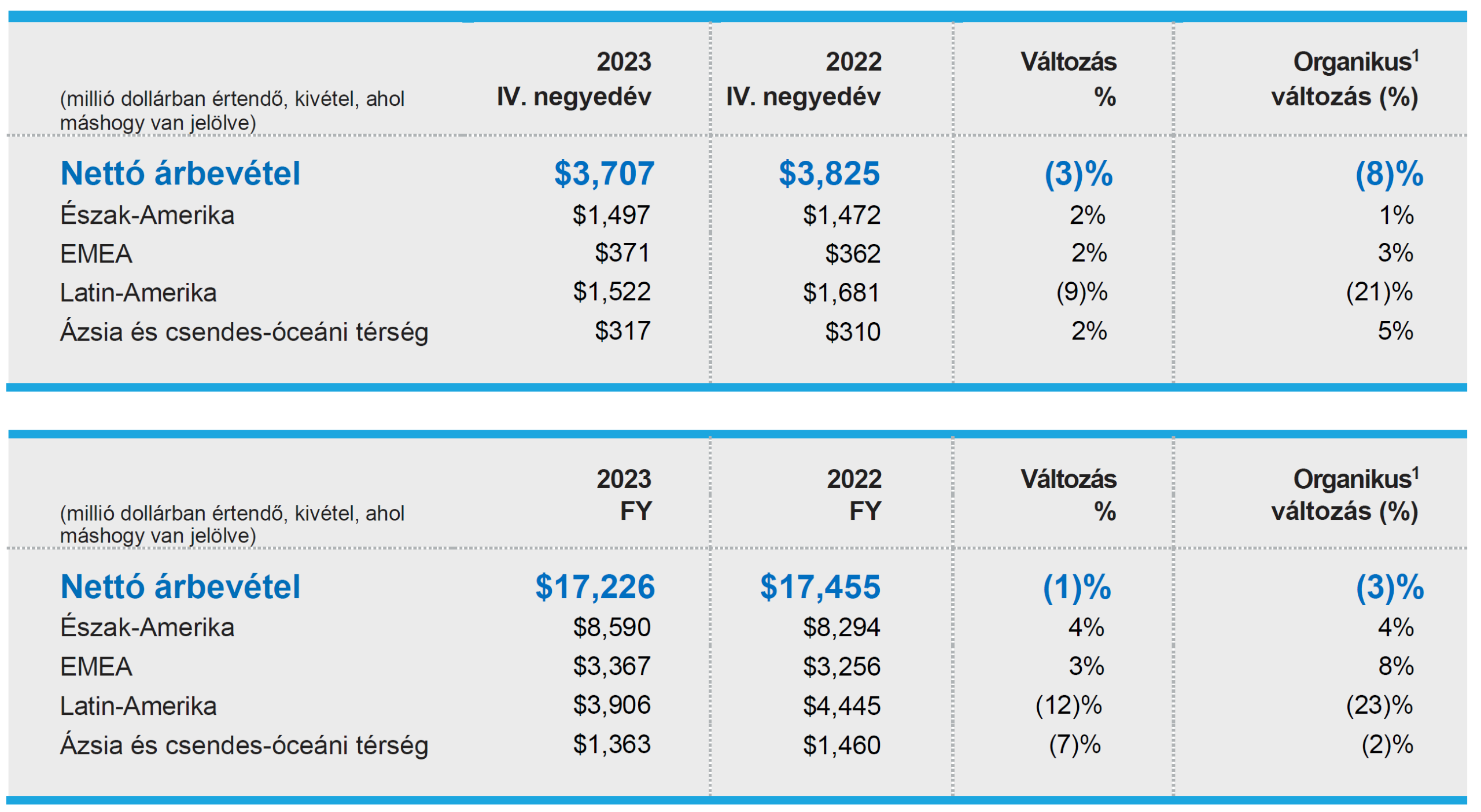 • A 2023-as egész éves nettó árbevétel 1%-kal, az organikus1 árbevétel pedig 3%-kal csökkent az előző évhez képest, az Észak-Amerikában2 és az EMEA2 térségben elért növekedést ellensúlyozta a Latin-Amerikában és az ázsiai és csendes-óceáni térségben bekövetkezett csökkenés.