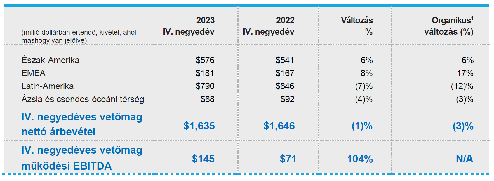 A vetőmag üzletág nettó árbevétele 2023 negyedik negyedévében 1,64 milliárd dollár volt, szemben a 2022 negyedik negyedévi 1,65 milliárd dollárral. Az árbevétel csökkenését a mennyiség 10%-os csökkenése okozta, amelyet részben ellensúlyozott a 7%- os árnövekedés és a 3%-os kedvező árfolyamhatás.