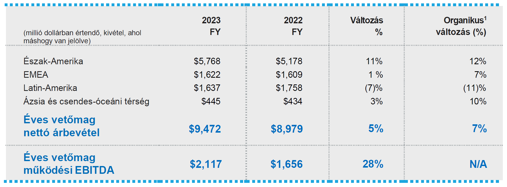 A vetőmagok nettó árbevétele 9,5 milliárd dollár volt a 2023-as teljes évben, szemben a 2022-es körülbelül 9,0 milliárd dollárral. Az árbevétel növekedését a 13%-os árnövekedés okozta, amelyet részben ellensúlyozott a mennyiség 6%-os csökkenése és a 2%-os kedvezőtlen árfolyamhatás.