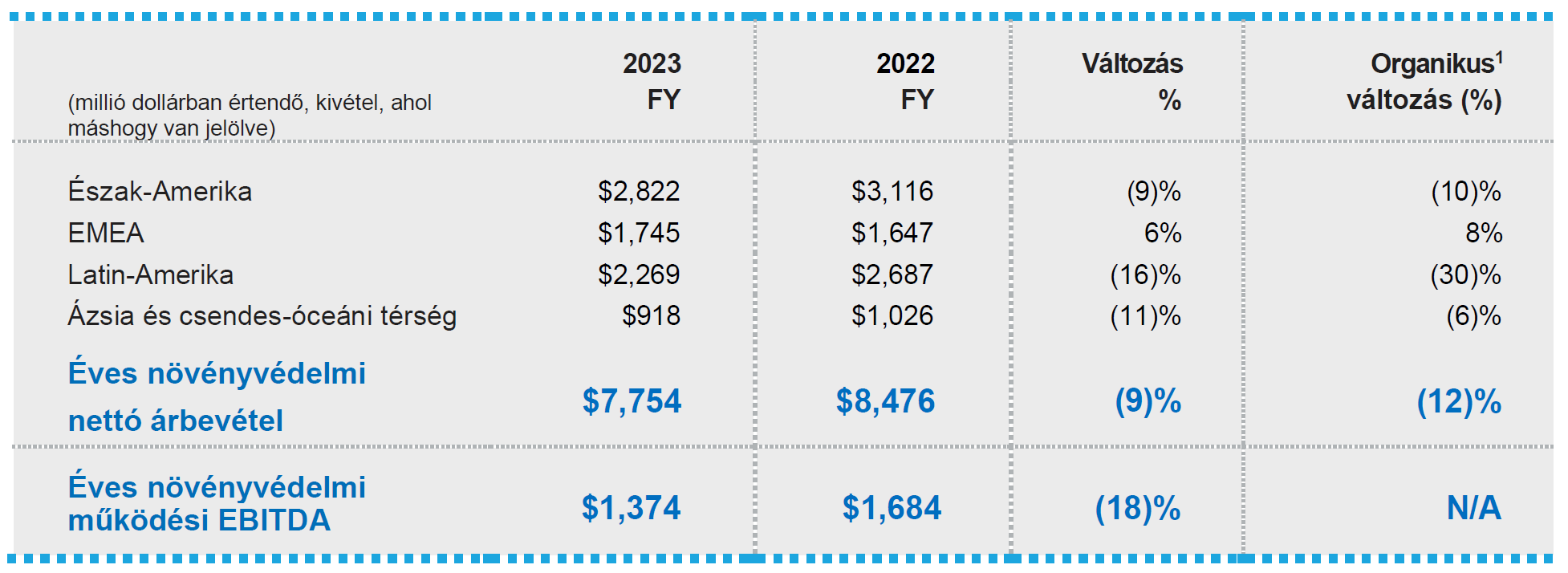 A növényvédelmi szegmens nettó árbevétele 2023 negyedik negyedévében megközelítőleg 2,1 milliárd dollár volt, szemben a 2022 negyedik negyedévi megközelítőleg 2,2 milliárd dollárral. Az árbevétel csökkenését a volumen 8%-os és az ár 4%-os csökkenése okozta, amit részben ellensúlyozott a portfólió 6%-os kedvező hatása.