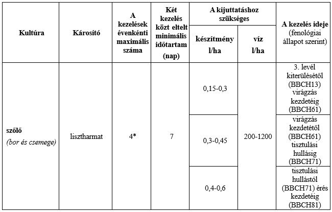 Javasolt növényvédelmi technológia: A Karathane™ Star-t a fertőzésveszélyes időszakban előrejelzésre alapozva, megelőző jelleggel, legkésőbb az első tünetek megjelenésekor kell kijuttatni. A kezelést a fertőzési veszélyhelyzettől függően 7-12 napos időközönként, szükség szerint legfeljebb további 3 alkalommal javasolt megismételni. A virágzás után a készítménnyel végzett kezelések száma nem haladhatja meg a kettőt.