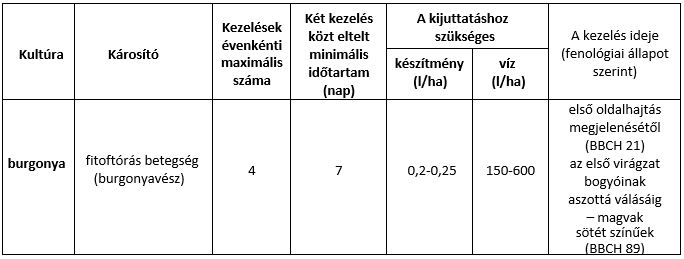 Fertőzésre hajlamosító körülmények között 7 napos permetezési forduló tartása és a maximális dózis kijuttatása indokolt.