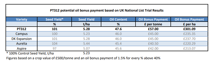 PT312 has given the highest oil content of any variety in 2021 & 2022 UK National List Trials. This level of oil content is likely to generate significant oil bonus payments. An illustration of the type of oil bonus payments that may be achieved can be seen in the table below.