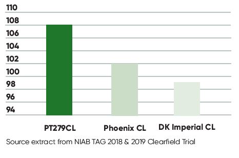 PT279CL is the most thoroughly tested Clearfield hybrid available in the UK and Ireland. Its high yields are combined with no obvious agronomic weaknesses.