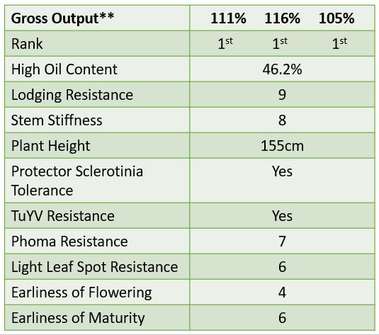 PT303 has consistently given top yields across multiple trial programs and provides tolerance to a disease that is associated with high rainfall events often experienced in the Ireland. PT303 also combines proven TuYV resistance and multigenic Phoma resistance for a powerful overall disease resistance rating.