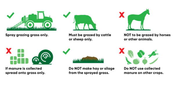 Forefront T and Halcyon are the best solutions for controlling weeds such as docks, nettles, thistles, buttercups, dandelions and ragwort. These products should only be applied to established grassland where cattle or sheep are grazed, due to herbicide residues being carried over into grass that is utilised for zero grazing, silage, hay or haylage. The resulting manure will affect sensitive crops if used as fertiliser.