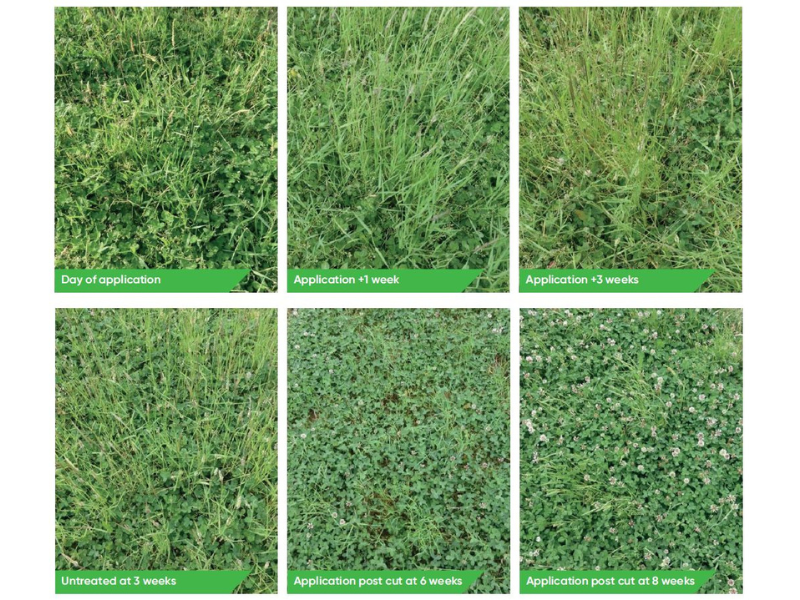 This timed series of photos started on 4th May and by 8 weeks and one cut, clover populations matched untreated plots.