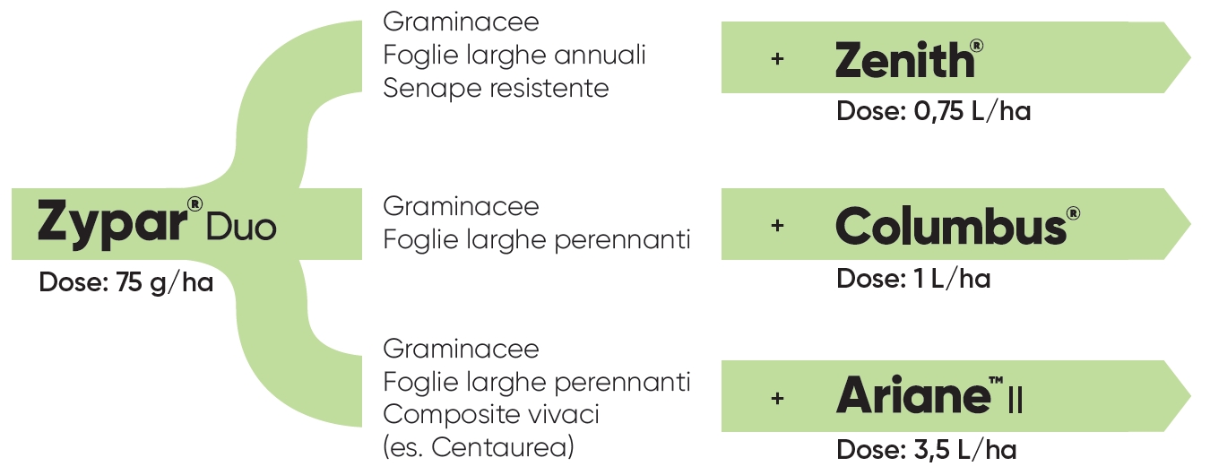 La piena compatibilità di Zypar Duo con gli erbicidi Zenith®, Columbus® e Ariane™ II permette di controllare rapidamente specifiche problematiche con un'efficacia prolungata nel tempo, consentendoti di produrre di più, con strategie di diserbo personalizzate: