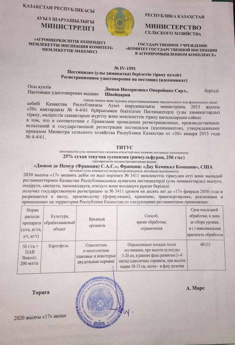 | 50г/Га + ПАВ Виволт® 200 мл/Га | Однолетние и многолетние злаковые и некоторые двудольные сорняки | Опрыскивание посадок после окучивания, при высоте культуры 5-20 см, в ранние фазы развития 91-4 листа) однолетних сорняков, при высоте пырея 10-15 см, осота – в фазу розетки | - (1))
