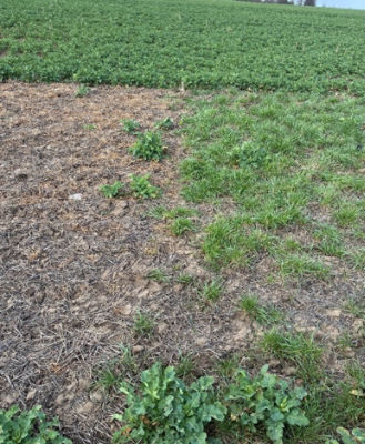 Daudzgadīgā airene 3 nedēļas pēc Novakerb smidzinājuma (decembra sākumā). Var redzēt jau pirmās pazīmes propizamīda iedarbībai – sabiezinātas stiebru pamatnes, ietekmē barības vielu uzņemšanu. Pilnu herbicīda efektivitāti var novērtēt pavasarī