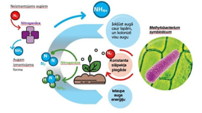 Nokļūstot augā, metilobaktērijas vairojas, kolonizē visu augu, un ļauj uzņemt slāpekli no gaisa. Nitrogenāzes procesā, kurā aktīvi piedalās metilobaktērijas, efektīvi pārveido atmosfērā esošo slāpekli N2 par augam viegli uzņemamu amonija slāpekli NH4+.