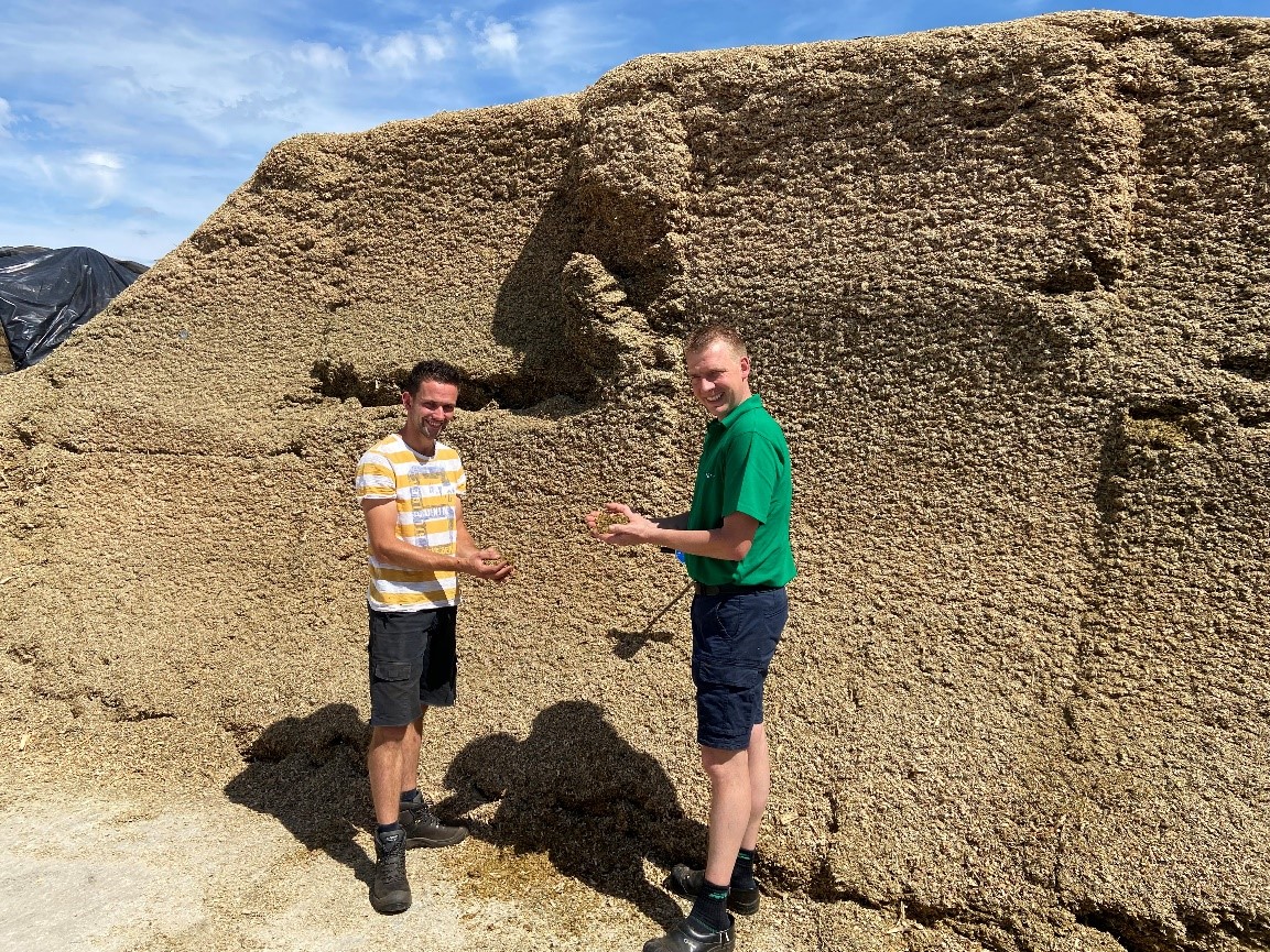 Pim Lenferink (links) met loonwerker Arjan Dekker (rechts) bij de maiskuil.