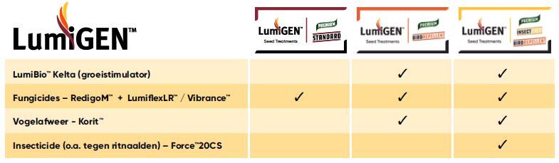 De LumiGEN™ productfamilie bestaat uit verschillende producten die elk zijn samengesteld naar behoefte van de plant. Naast de Standaard-ontsmetting waar alleen een fungiciden-ontsmetting op zit hebben we ook een LumiGEN™ Premium Bird Repellent variant. Deze bevat naast de fungiciden ook Korit™ tegen vogelvraat en LumiBio™ Kelta.