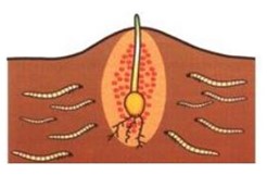 Zie bovenstaand plaatje: Pas als het roze granulaat goed om het zaad & kiemplantje verdeeld wordt kan het een ‘beschermde zone’ vormen tegen aantasting van schadelijke insecten.