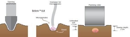 Het is daarom goed om extra aandacht te besteden aan een goede verdeling van de korrels. Dit zoals op bovenstaand plaatje duidelijk wordt gemaakt. Wellicht kan de uitstroom van de granulaatstrooier in het zaaikouter qua afstelling iets meer achterin het kouter worden gericht, zodat er ook korrels boven het zaad terechtkomen.
