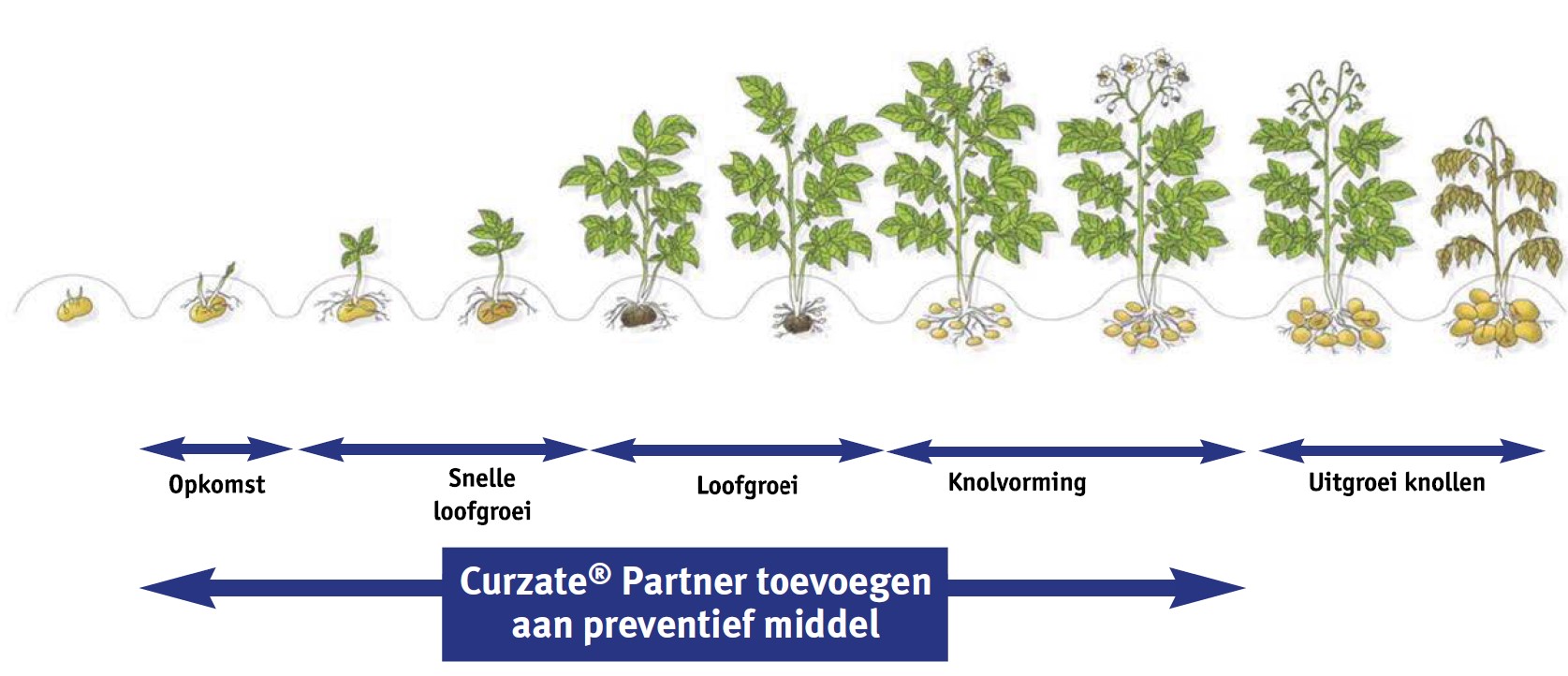 Bij een wisselmoment moeten we altijd extra alert zijn. Wanneer de weersomstandigheden ervoor zorgen we uit het schema lopen, dan kunnen we aan deze bespuitingen Curzate® Partner toevoegen. Curzate Partner bevat de werkzame stof Cymoxanil.