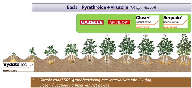 Closer / Sequoia zijn toegelaten ná de bloei van de aardappelen. Volgens de BBCH schaal betekent dit stadium 69 = einde bloei. Dat moment varieert uiteraard per ras en per jaar. Uit onderzoek van de NAK (gedurende 2013 tot 2018) weten we dat een flink deel van de virusaantasting ná de bloei ontstaat. Gemiddeld was het % virus op moment van loofdoding rond ½ juli iets meer dan 10%. Bij loofdoding eind augustus was het % virus in de meeste jaren hard opgelopen.