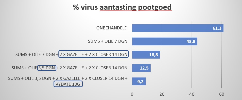 In de onbehandelde veldjes hadden we ruim 61% aantasting. Dit konden we stapsgewijs terugbrengen tot uiteindelijk 9,2% door de volgende maatregelen te nemen: