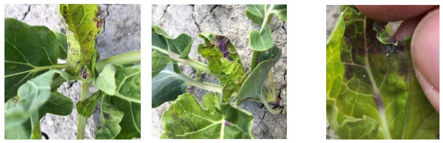 Foto links en midden : de jongste bladeren vertonen een paarsachtige verkleuring en vergroeiing.