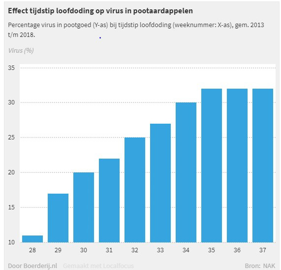 Closer en Sequoia zijn toegelaten na de bloei van de aardappelen. Volgens de BBCH schaal betekent dit stadium 69 (= einde bloei). Dat moment varieert uiteraard per ras en per jaar. Uit onderzoek van de NAK (gedurende 2013 tot 2018) weten we dat een groot deel van de virusaantasting ook na de bloei ontstaat. Gemiddeld was het % virus aantasting op moment van loofdoding rond ½ juli iets meer dan 10%. Bij loofdoding eind augustus was dit % virus aantasting al opgelopen naar ruim 30%.