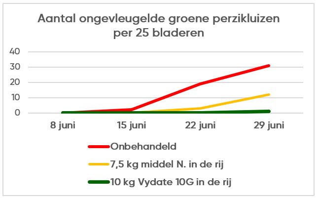 Onderstaande grafiek toont de luiswerking van Vydate 10G in aardappels in de periode kort na opkomst. Dit onderzoek is in 2020 gedaan door Proeftuin Zwaagdijk. Na opkomst werd wekelijks het aantal luizen per 25 samengestelde bladeren geteld. Hieronder ziet u de resultaten. (Opkomst aardappels = 5 juni).