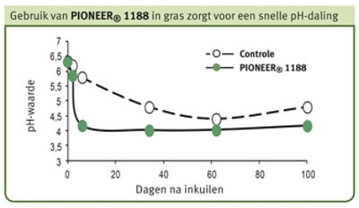 Combi-inoculanten bevatten vaak zowel melkzuurbacteriën als een broeiremmer (L. buchneri). In de latere snedes is echter vooral de snelle conservering belangrijk. Het is belangrijk om daar dan ook maximaal op te focussen. Broei is namelijk meestal geen issue in deze kuilen. Daardoor heeft het vaak minder zin om combi-middelen te gebruiken, die zowel wat doen op broei als op conservering. Door het gebruik van het enkelvoudige middel 1188, wordt gezorgd voor een zeer snelle pH-daling.