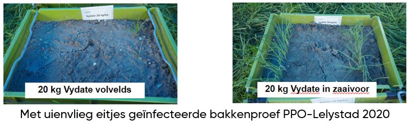 In een vergelijking met rijentoepassing en volveldstoepassing (beide 20kg/ha) is er maar één conclusie mogelijk: Vydate 10G moet in de rij worden toegepast!