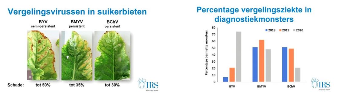De meest voorkomende soorten vergelingsvirus zijn BYV, BMYV en BChV (Bron: IRS)