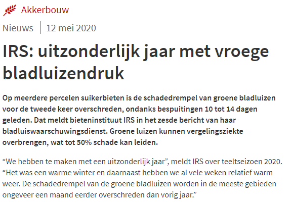 Vrijdag 22 mei 2020 heeft de Staatscourant de vrijstelling voor het gebruik van Closer in suikerbieten gepubliceerd. Hiermee mag Closer worden ingezet ter bestrijding van luis en ter beheersing van het vergelingsvirus in suikerbieten. Deze vrijstelling is aangevraagd door COSUN in samenwerking met het IRS en de BO Akkerbouw.