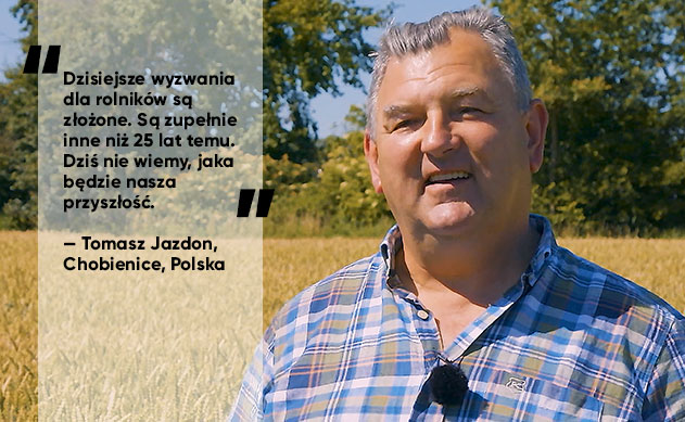 Tomasz Jazdon, rolnik z Chobienic w Polsce, mówi: „Dzisiejsze wyzwania dla rolników są złożone. Są zupełnie inne niż 25 lat temu. Dziś nie wiemy, jaka będzie nasza przyszłość. Obecnie walczymy o rentowność produkcji. Gospodarka zmieniła się ogromnie. Przyszłość to przede wszystkim optymalizacja produkcji i kosztów. Gospodarstwa muszą być większe, bardziej efektywne i wydajne”.