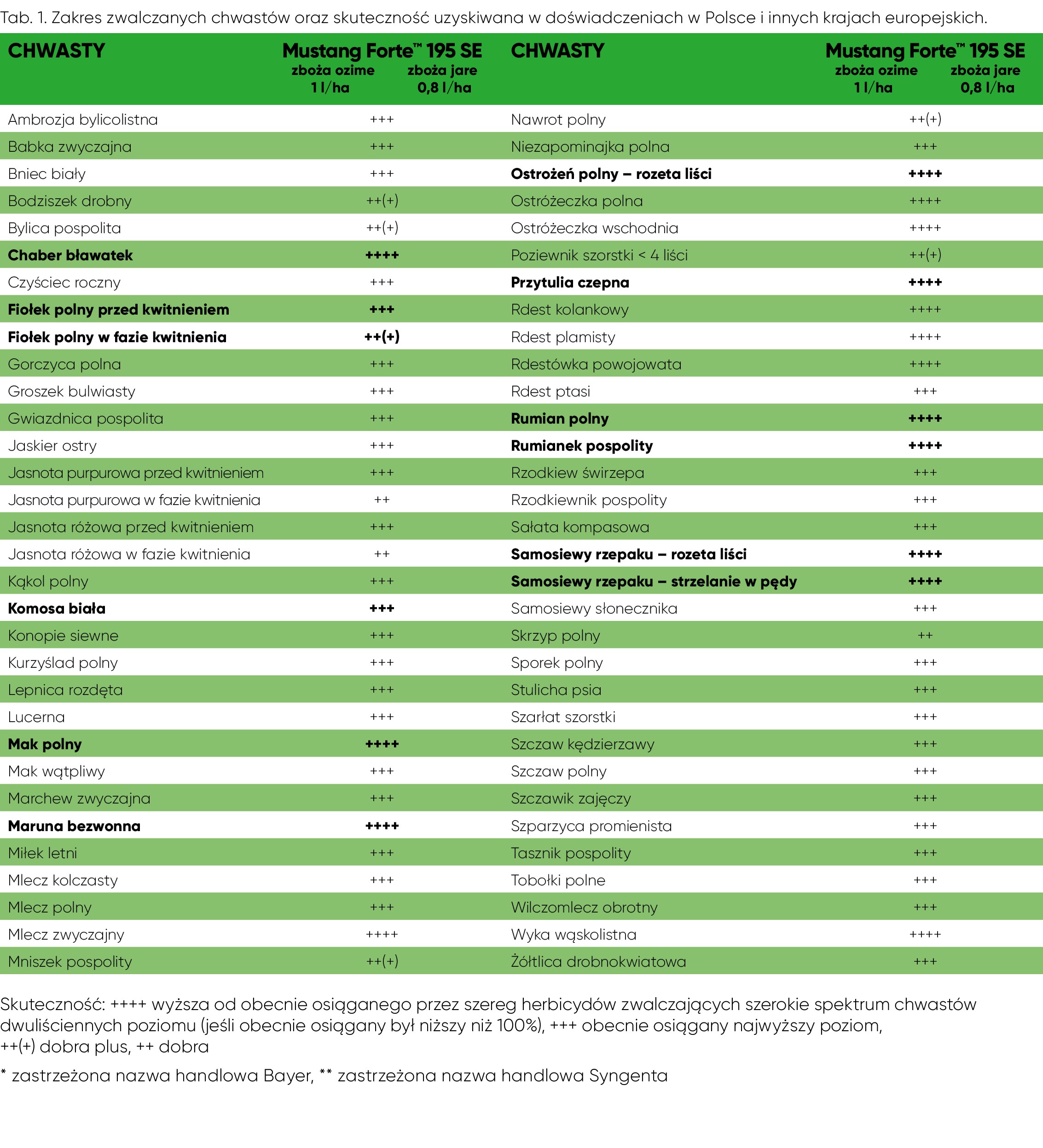 Wyniki badań potwierdziły wysoką skuteczność preparatu Mustang Forte™ 195 SE w dawce 0,8 l/ha na: przytulię czepną, chabra bławatka, chwasty rumianowate, mak polny, samosiewy rzepaku, gwiazdnicę pospolitą, tasznik pospolity, tobołki polne.