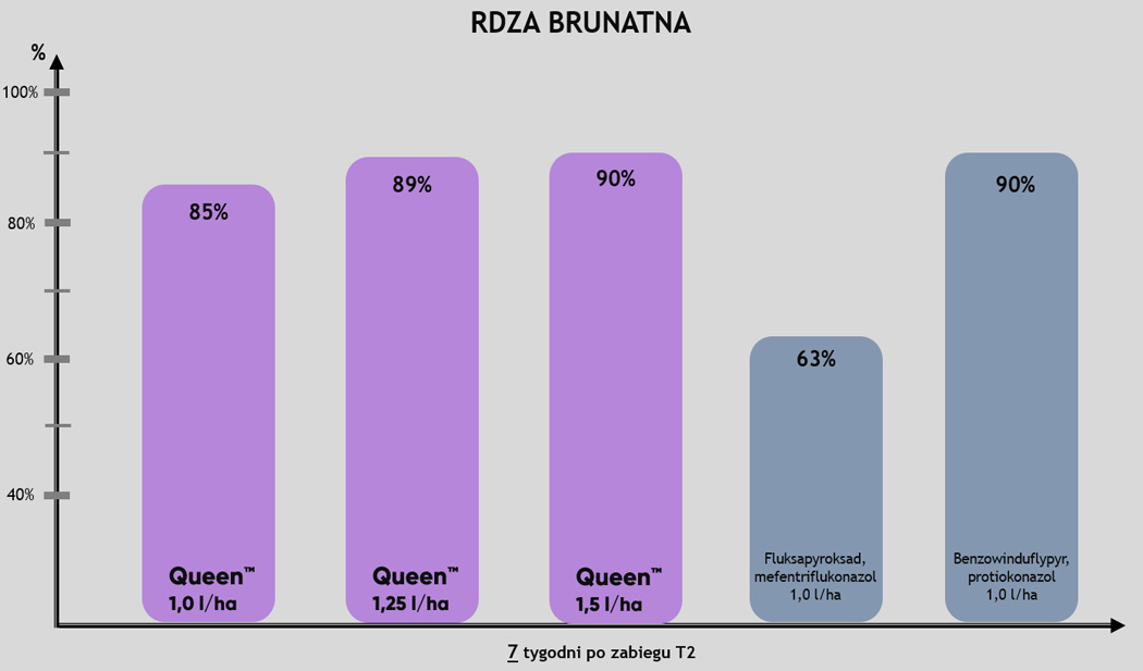 Queen™ to fungicyd na T2, który chroni Twoje uprawy do 6 tygodni od wykonania zabiegu! Bardzo wysoka skuteczność na septoriozę paskowaną liści pszenicy, rdzę żółtą czy rdzę brunatną, została potwierdzona także w polskich warunkach klimatycznych.