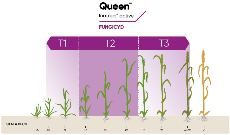 Fungicyd na T2 Queen™ należy stosować od początku fazy strzelania w źdźbło do końca fazy kwitnienia (BBCH 30-69) w dawce 1,0- 1,5 l/ha. Dawka stosowania jest od spodziewanej presji chorobowej występującej na plantacji. Najlepszy termin dla zastosowania produktu to tzw. zabieg T2 w okresie faz rozwoju zbóż BBCH 37-51 (od liścia podflagowego, przez flagowy do początku kłoszenia). Środek na T2 w pszenicy, pszenżycie i życie należy stosować zapobiegawczo lub z chwilą wystąpienia pierwszych objawów choroby.