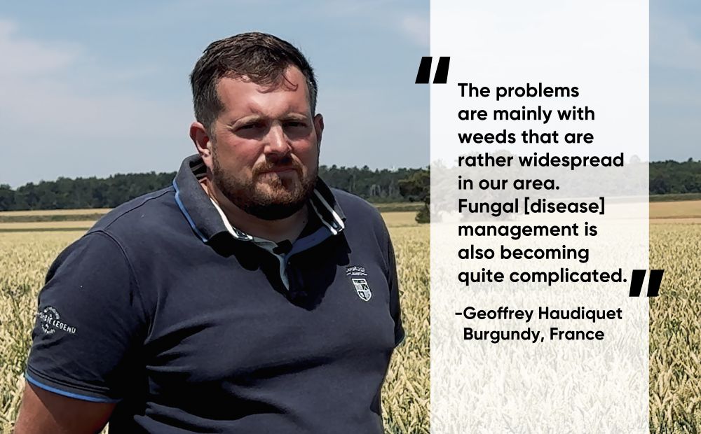 Geoffrey Haudiquet, who farms in Burgundy, France, is dealing with multiple issues across the season. “The problems are mainly with weeds that are rather widespread in our area. We will have grass which comes back often and then some perennials and [broadleaf weeds],” he said. “After that, we’ll have all the diseases that we find in the spring. Fungal [disease] management is also becoming quite complicated.”