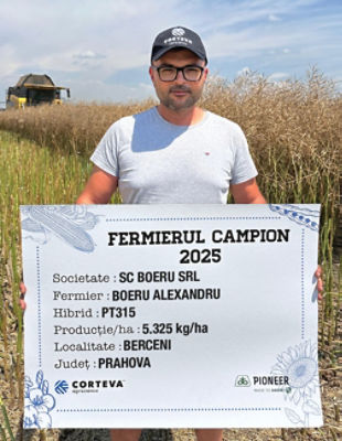 Domnul Alexandru Boeru din localitatea Berceni, județul Prahova, a obținut o producție de 5.325 kg/ha. Dumnealui lucrează 575 ha, rapiță a semănat pe 131 ha și a ales pentru 105 ha hibridul PT315, sămânță tratată cu Lumiposa.