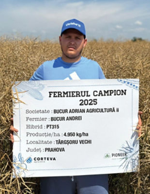 “Am semănat acest hibrid după cultură de grâu, terenul a fost lucrat în sistem Minimum Tillage, iar fertilizarea a fost realizată în urma cartării agrochimice, iar în urma rezultatelor am decis ce și cum aplicăm. În cazul hibridului PT315 am aplicat DAP – 180 kg/ha și am semănat în data de 19 august. Am aplicat în toamnă un fungicid pe bază de tebuconazol și au fost 2-3 intervenții cu insecticide pentru protecția plantelor de afide. În primăvară am fertilizat cu uree -135 kg/ha, precum și cu sulfat de amoniu la început de aprilie – 165 kg/ha. Primul tratament a fost aplicat la alungirea tijei, atunci am dat fungicid și insecticid de contact, precum și foliar cu bor, după care la începutul înfloritului am aplicat insecticidul Inazuma și fungicidul Capartis. Am recoltat în jurul datei de 10 iulie și pot spune că acest hibrid s-a adaptat foarte bine la variațiile de temperatură, chiar și la acel îngheț târziu, la precipitațiile abundente sau la căldura din perioada înfloritului și a reușit să ne ofere o producție foarte mare, nu mă așteptam la acest rezultat. Hibridul are un potențial mai ridicat, au fost zone unde producția a fost mult mai mare, 5.325 kg/ha a fost producția medie la acest hibrid. A fost un an bun pentru rapiță, chiar dacă au fost și parcele mai slabe, pentru că nu am întors nicio cultură unde în toamnă au mai fost probleme, chiar dacă nu am avut densitate, totuși media pe fermă a fost 4.841 kg/ha, vorbesc de tot ceea ce am livrat. Pentru că sunt adeptul rotațiilor mai lungi, voi semăna maxim 170 ha cu rapiță în această toamnă, atât îmi permite terenul pe care îl lucrez”, a punctat fermierul campion. Acesta a mai adăugat faptul că a fost foarte mulțumit de PT315 motiv pentru care 90% din suprafața dedicată rapiței în această toamnă va fi semănată cu acest hibrid.