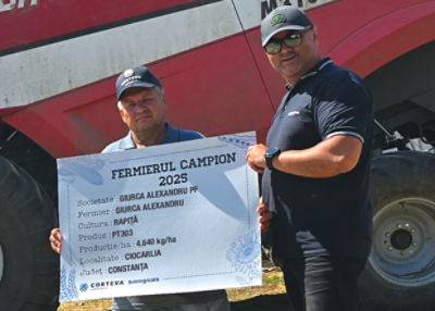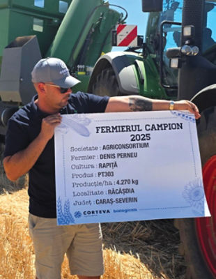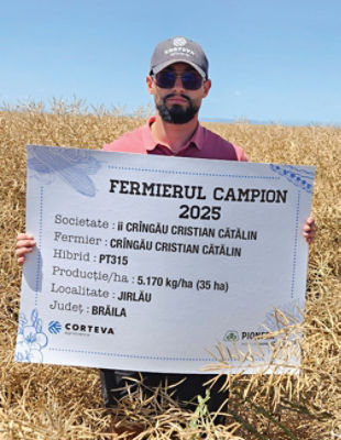 Hibridul PT303 a oferit din nou rezultate spectaculoase în Dobrogea, o regiune în care rapița a redevenit o cultură rentabilă în acest an. Astfel, domnul Alexandru Giurcă din localitatea Ciocârlia, județul Constanța, a devenit fermier campion cu o producție spectaculoasă de 4.640 kg/ha. “În jurul datei de 20 septembrie am semănat 10 ha cu rapiță, după orzoaică de toamnă, direct în miriște și am fertilizat în același timp cu 100 kg/ha sulfat de amoniu plus 100 kg/ha îngrășământ 18.46.0. În toamnă nu am mai intrat în cultură, apoi în primăvară am aplicat uree – 120 kg/ha, iar ultima fertilizare a fost cu azot - 100 kg/ha, după 15 aprilie. În ceea ce privește tratamentele, cred că la început de aprilie a fost prima intervenție cu fungicid și insecticid, după care, la finalul înfloritului, am aplicat cu drona insecticid sistemic și de contact, alături de un fungicid. În ceea ce privește precipitațiile cred că am avut cca. 200 l/ha, iar recoltatul a fost până în 10 iulie. Pot spune că am fost foarte mulțumit de ambii hibrizi Pioneer pe care i-am semănat, am avut și momente în care recoltam și peste 5 t/ha, însă aceasta a fost media obținută, adică 4.640 kg/ha”, a declarat domnul Giurcă.