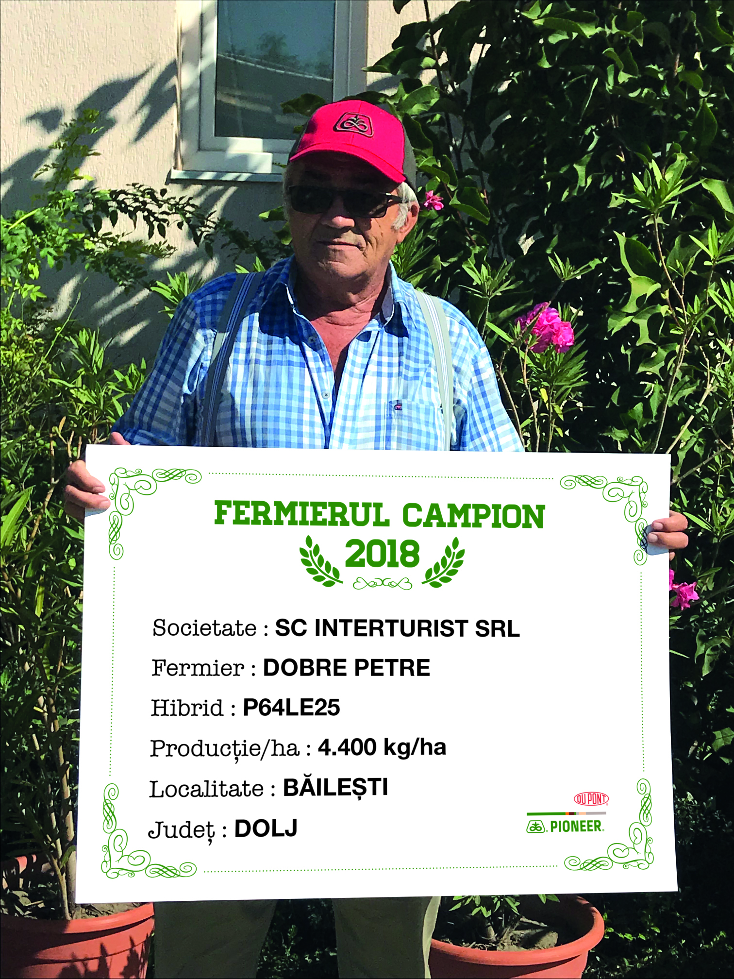 În comuna Amărăștii de Jos, județul Dolj, își desfășoară activitatea fermierul campion Petre Dobre. Acesta a obținut 4.400 kg/ha cu hibridul P64LE99. “Lucrez 900 ha, iar floarea-soarelui am semănat 300 ha după grâu. Am arat din toamnă și am aplicat îngrășăminte complexe 18.46.0 – 200 kg/ha, iar în primăvară, înainte de semănat, am mai aplicat 200 kg/ha de 16.16.16. apoi la jumătatea lunii aprilie am semănat. Cultura a mai primit un fungicid, un foliar și un erbicid, nu am prășit și nici nu am mai fertilizat în vegetație. Am recoltat la finalul lunii august, iar în următoarea campanie voi semăna 200 ha cu floarea-soarelui, toată suprafața doar cu hibridul P64LE25 pentru că îl cultiv de mult timp și sunt mulțumit de producțiile pe care le oferă”, a punctat fermierul doljean.