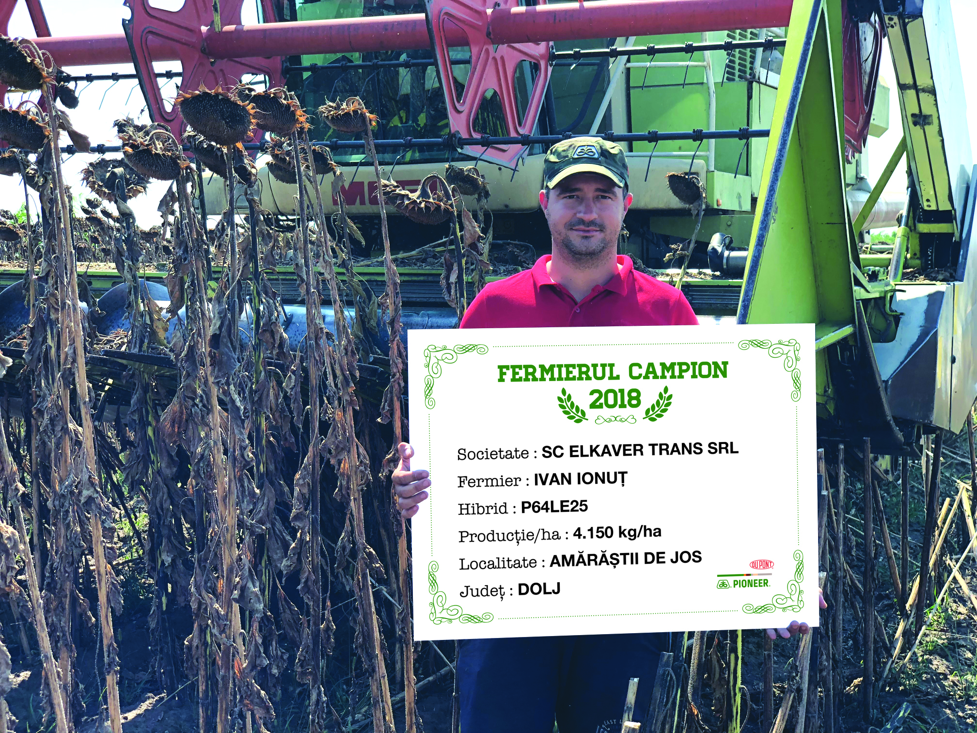 Tot în județul Dolj își desfășoară activitatea și domnul Ionuț Ivan, care a devenit fermier campion cu producția de 4.150 kg/ha obținută cu hibridului P64LE25. Acesta lucrează 450 ha, pe 150 ha a semănat în acest an floarea-soarelui, iar pe lângă hibridul P64LE25 a semănat și P64LE99, iar la finalul recoltatului, media finală obținută pe fermă a fost 3.750 kg/ha. “Am semănat floarea-soarelui după grâu și orz. Astfel că am arat în toamnă, după care lucrat cu combinatorul, am aplicat 300 kg/ha complexe 15.15.15 și am semănat începând cu 12 aprilie. Cultura a primit două erbicide, azot - 170 kg/ha, după care am aplicat Acanto Plus și bor, în faza de 12 frunze. Am recoltat în jurul datei de 22 august, sunt foarte mulțumit de acești doi hibrizi pe care îi semăn cred că de vreo 6 ani, de aceea și anul viitor voi semăna 180, jumătate cu P64LE25 și jumătate cu P64LE99”, a precizat agricultorul.
