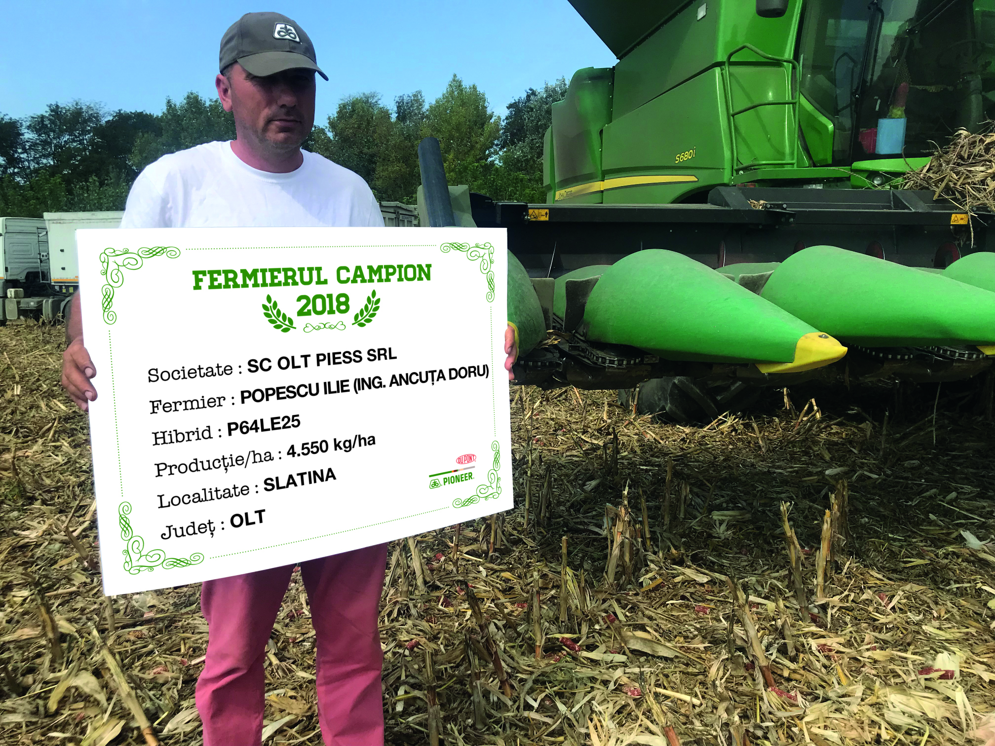 În cadrul fermei Olt Piess a fost obținută cea mai mare producție din Oltenia, 4.550 kg/ha cu hibridul P64LE25. Despre tehnologia aplicată în această fermă ne-a detaliat domnul Ilie Popescu: „Anul acesta am avut 200 ha cu floarea-soarelui, iar cultura premergătoare a fost grâul. În toamnă am arat la adâncimea de 35 cm, iar în primăvară am pregătit terenul cu un combinator și am fertilizat cu 400 kg/ha complex 15.15.15, după care am semănat în perioada 10-20 aprilie. După semănat am mai fertilizat cu nitrocalcar - 450 kg/ha. Am aplicat două erbicide – un graminicid și Express, dar și un fungicid”, a declarat fermierul campion. Acesta a mai adăugat faptul că a recoltat după 15 august și pentru condițiile din acest an a fost foarte mulțumit de producția obținută.