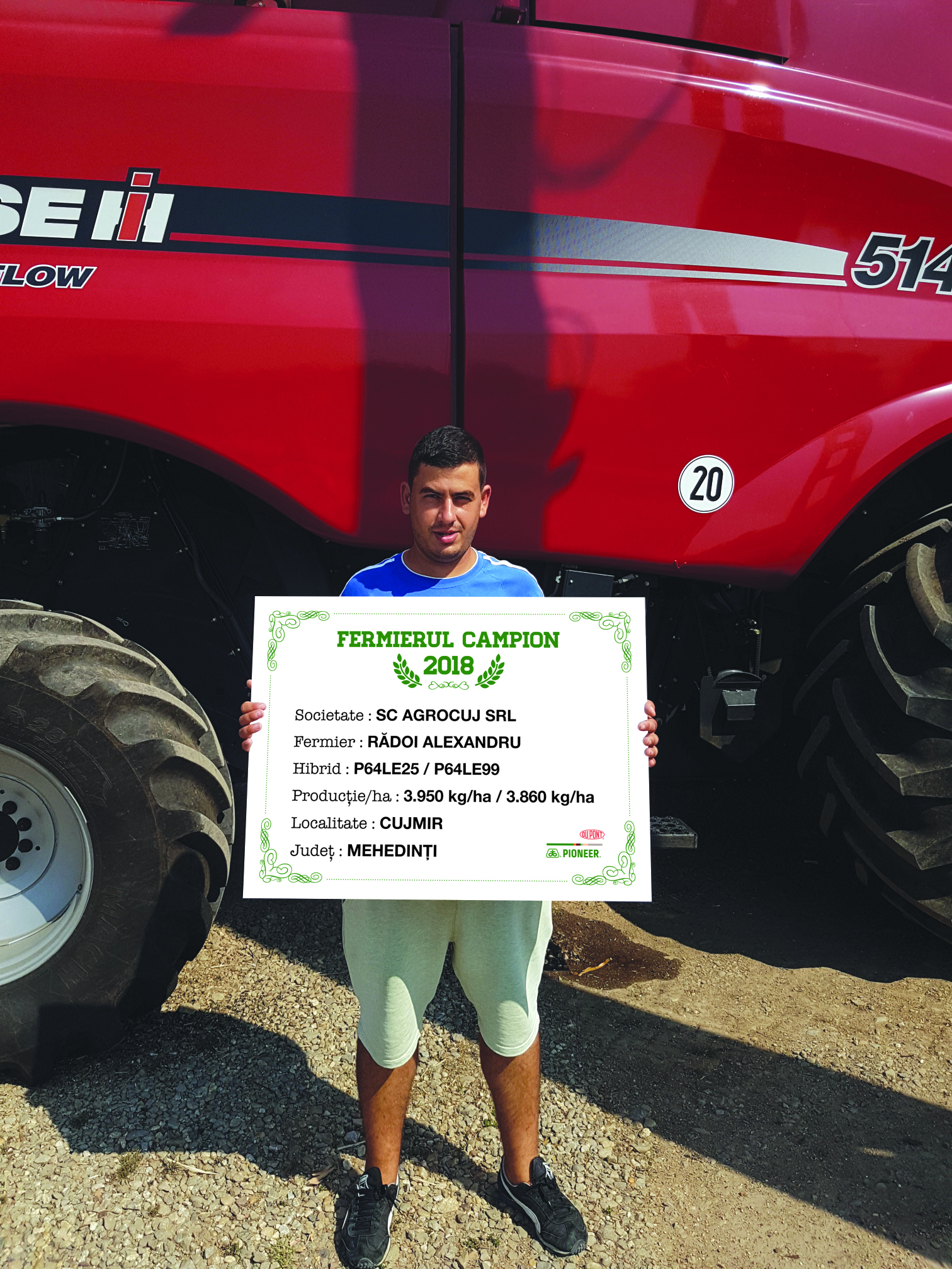 În județul Mehendinți, fermier campion este domnul Alexandru Rădoi, care a obținut 3.950 kg/ha cu hibridul P64LE25 și 3.860 kg/ha cu hibridul P64LE99. “Lucrez aproximativ 336 ha, cu floarea-soarelui am semănat 110 ha. După recoltarea grâului am curățat miriștea, am dat cu erbicid, am arat și am aplicat complexe 18.46.0 – 200 kg/ha. După care în primăvară am efectuat o trecere cu discul și una cu combinatorul. Cultura a beneficiat de un prim tratament cu insecticid, erbicid - Expres și un foliar. Pentru că a fost anul mai ploios am mai dat un fungicid și un insecticid. Nu am prășit în acest an pentru că nu aveam utilajele necesare, am achiziționat un cultivator, dar la finalul perioadei de prășit, îl vom folosi începând cu următoarea campanie”, a declarat fermierul. Acesta a mai adăugat faptul că a început recoltatul în jur jurul datei de 20 august, iar anul viitor va semăna120 ha cu floarea-soarelui.