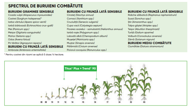 • Titus® Plus erbicid postemergent pentru porumb, cu cel mai larg spectru de buruieni graminee anuale și buruieni cu frunză lată anuale și perene combătute.
