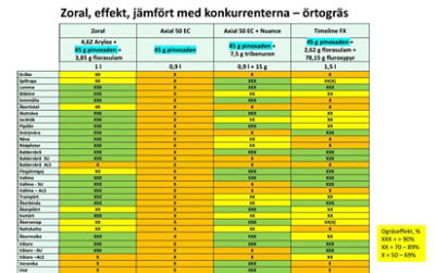 Nedan visas en jämförelsetabell över effekten på örtogräs för Zoral och andra produkter på den svenska marknaden som innehåller pinoxaden. För att göra jämförelsen så rättvis som möjligt är alla preparat satta till en dos motsvarande 45 g pinoxaden.