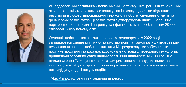 Corteva Agriscience — це глобальна виключно сільськогосподарська компанія, акції якої котируються на біржі. Компанія поєднує передові інновації, активну взаємодію із клієнтами та оперативну діяльність з метою вигідної розробки рішень для серйозних глобальних викликів, з якими стикається сільське господарство. Corteva створює переваги на ринку завдяки своїй унікальній стратегії дистрибуції та збалансованому, глобально різноманітному портфелю насіння, засобів захисту рослин, а також цифрових продуктів та послуг. Будучи представленою одними з найвідоміших брендів у сільському господарстві та володіючи портфелем технологій для забезпечення зростання, компанія прагне максимізувати продуктивність фермерів, працюючи із зацікавленими сторонами по всій продовольчій системі та виконуючи своє зобов'язання збагачувати життя тих, хто виробляє, та тих, хто споживає, забезпечуючи розвиток майбутніх поколінь. Детальнішу інформацію можна знайти на сайті www.corteva.com/ua.