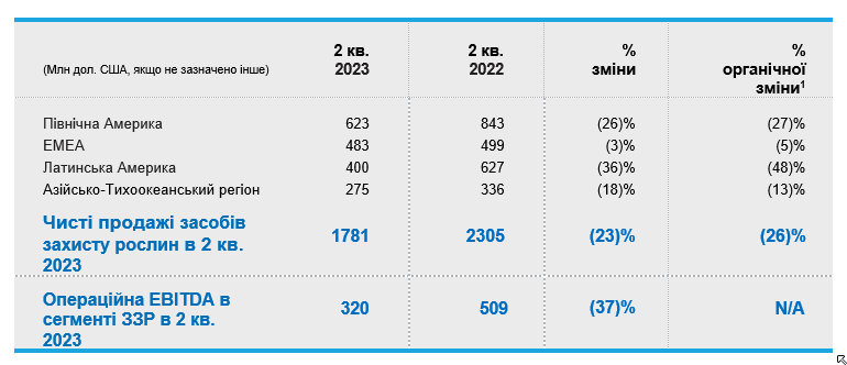 Чистий обсяг продажів засобів захисту рослин склав приблизно 1,8 млрд дол. США в другому кварталі 2023 року порівняно з приблизно 2,3 млрд дол. США в другому кварталі 2022 року. Зменшення продажів відбулося через зменшення обсягів на 29% та несприятливий валютний вплив на 1%, що було частково компенсоване сприятливим впливом портфоліо на 4% та зростанням цін на 3%.