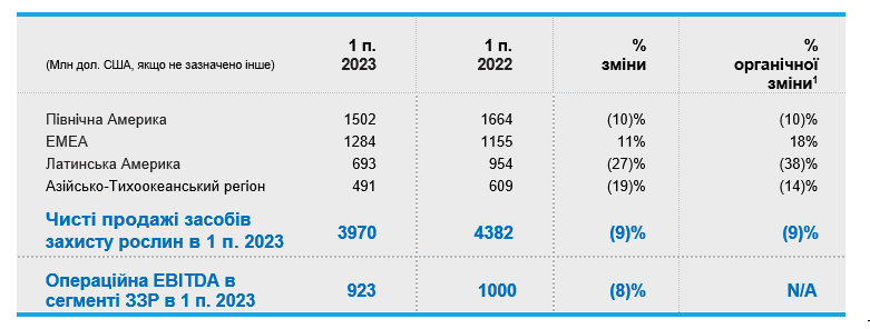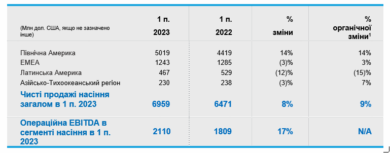 • Чистий обсяг продажів в першому півріччі 2023 р. зріс на 1% порівняно з попереднім роком за рахунок зростання в сегменті насіння. Органічні продажі1 зросли на 2% за той же період, передовсім в Північній Америці2 та ЕМЕА2.