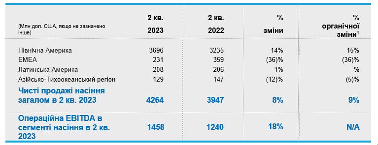 У першому півріччі 2023 року чистий обсяг продажів насіння склав 7 млрд дол. США, що вище за 6,5 млрд. дол. США у першому півріччі 2022 року. Приріст продажів зумовлений зростанням цін на 14% та сприятливим впливом портфелю на 2%, що було частково нівельовано зменшенням обсягів на 5% і несприятливим впливом валюти на 3%.