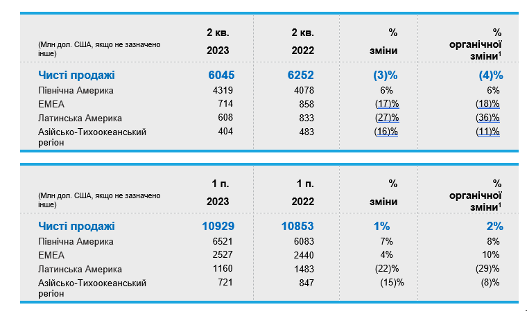 У другому кварталі, який закінчився 30 червня 2023 року, чистий обсяг продажів знизився на 3% порівняно з аналогічним періодом минулого року. Органічні1 продажі зменшилися на 4%.