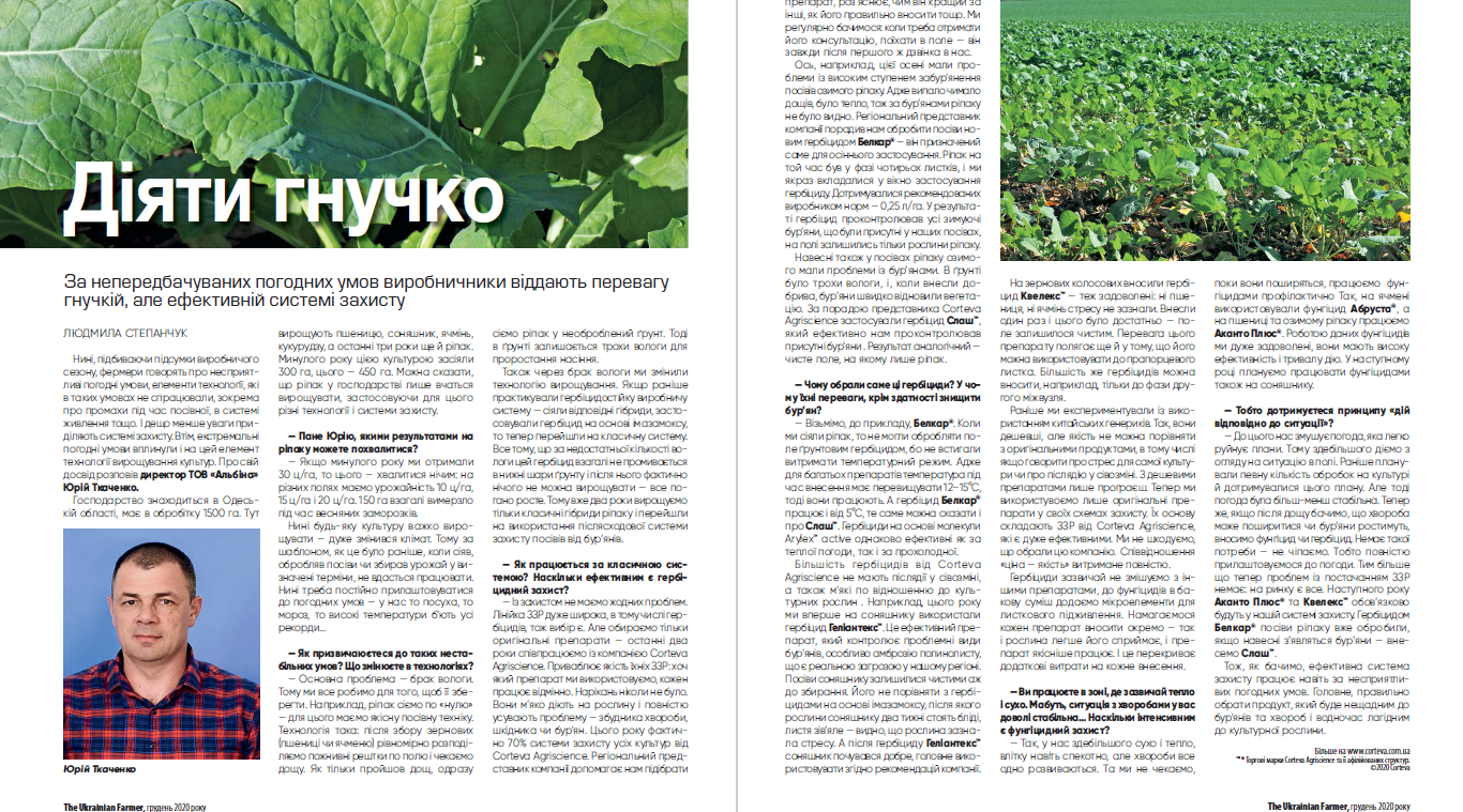 — Із захистом не маємо жодних проблем. Лінійка ЗЗР дуже широка, в тому числі гербіцидів, тож вибір є. Але обираємо тільки оригінальні препарати — останні два роки співпрацюємо із компанією Corteva Agriscience. Приваблює якість їхніх ЗЗР: хоч який препарат ми використовуємо, кожен працює відмінно. Нарікань ніколи не було. Вони м’яко діють на рослину і повністю усувають проблему — збудника хвороби, шкідника чи бур'ян. Цього року фактично 70% системи захисту усіх культур від Corteva Agriscience. Регіональний представник компанії допомагає нам підібрати препарат, роз’яснює, чим він кращий за інші, як його правильно вносити тощо. Ми регулярно бачимося: коли треба отримати його консультацію, поїхати в поле — він завжди після першого ж дзвінка в нас.