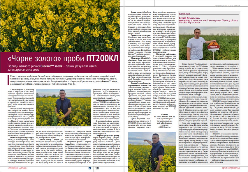 Ріпак — культура прибуткова. Та, щоб досягти бажаного результату, треба вкласти в неї чимало ресурсів і праці. Справжній фахівець знає, який гібрид потішить стабільним добрим урожаєм на полях його господарства. Про те, чому для вирощування в складних умовах Запорізької області обирають гібриди озимого ріпаку Brevant™ seeds, розповідає Євген Носач, головний агроном ТОВ «Олександр Агро 2»